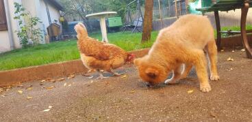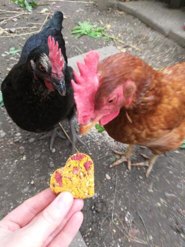 Caption: Chickens interested in biscuit