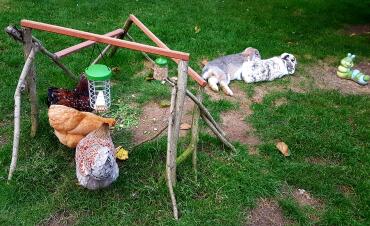 Caption: Chickens eating food while rabbits lay down in garden