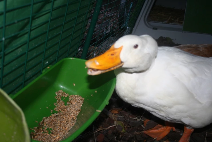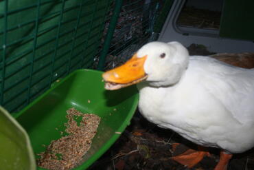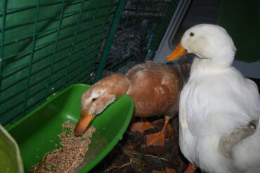 Caption: Ducks in Omlet Eglu Duck House Run eating from feeder