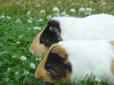 Caption: Guinea Pigs outside eating grass