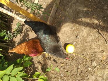 Caption: Chickens playing with Manna Pro Chicken toy ball