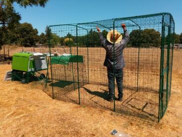 Caption: Man setting up Omlet Walk in Chicken Run with Omlet Green Eglu Cube Large Chicken Coop and Run