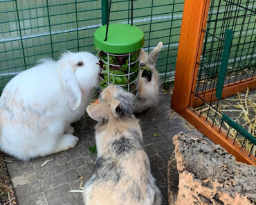 Caption: Rabbits eating from Omlet Rabbit Caddi Treat Holder