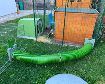Caption: Omlet Green Eglu Go Rabbit Hutch connected to Omlet Walk in Rabbit Run and Omlet Zippi Tunnel Connected to Run