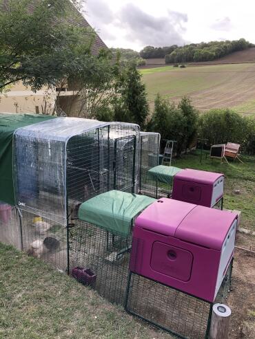 Caption: Two Omlet Purple Eglu Cube Large Chicken Coops and Runs connected to Omlet Walk in Chicken Runs