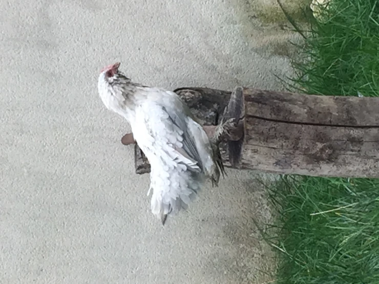 Caption: Chicken sitting on post