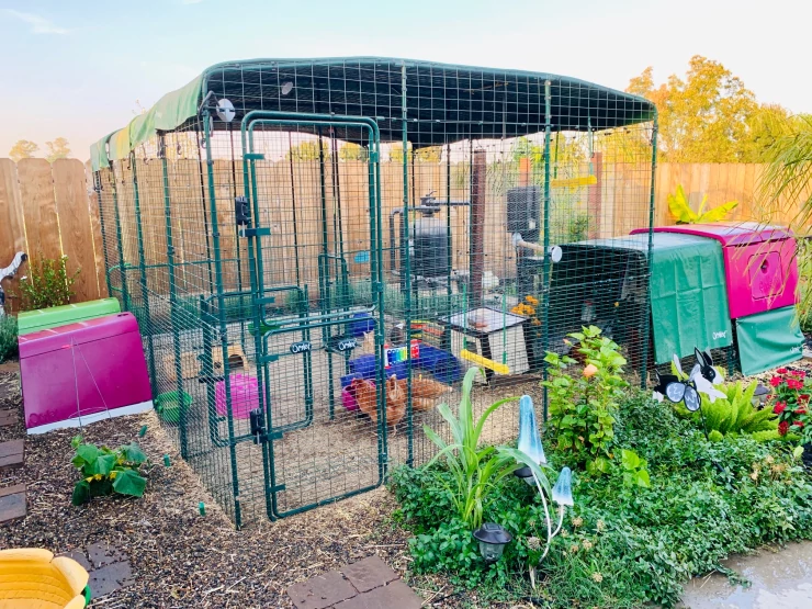 Caption: Omlet Walk in Chicken Run with Purple Eglu Cube Large Chicken Coop and Run Connected with Green and Purple Eglu Go UP Raised Chicken Coops Connected