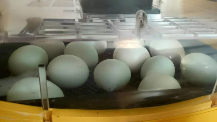Caption: Blue araucana eggs in the incubator