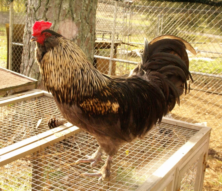 Caption: Olive Egger hybrid rooster - bred to produce olive colored eggs from a Fr Black Copper Marans rooster and a Splash Ameraucana hen